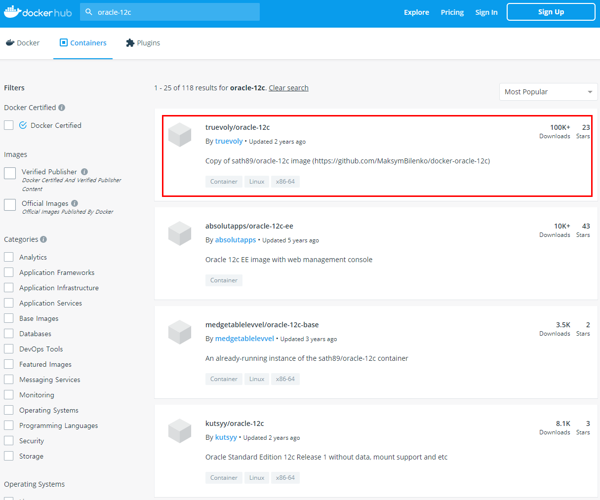 검색 결과중에 가장 위에, 가장 많은 다운로드수를 기록하고 있는 truevoly/oracle-12c 라는 컨테이너를 다운로드 받아서 사용 해보겠습니다.