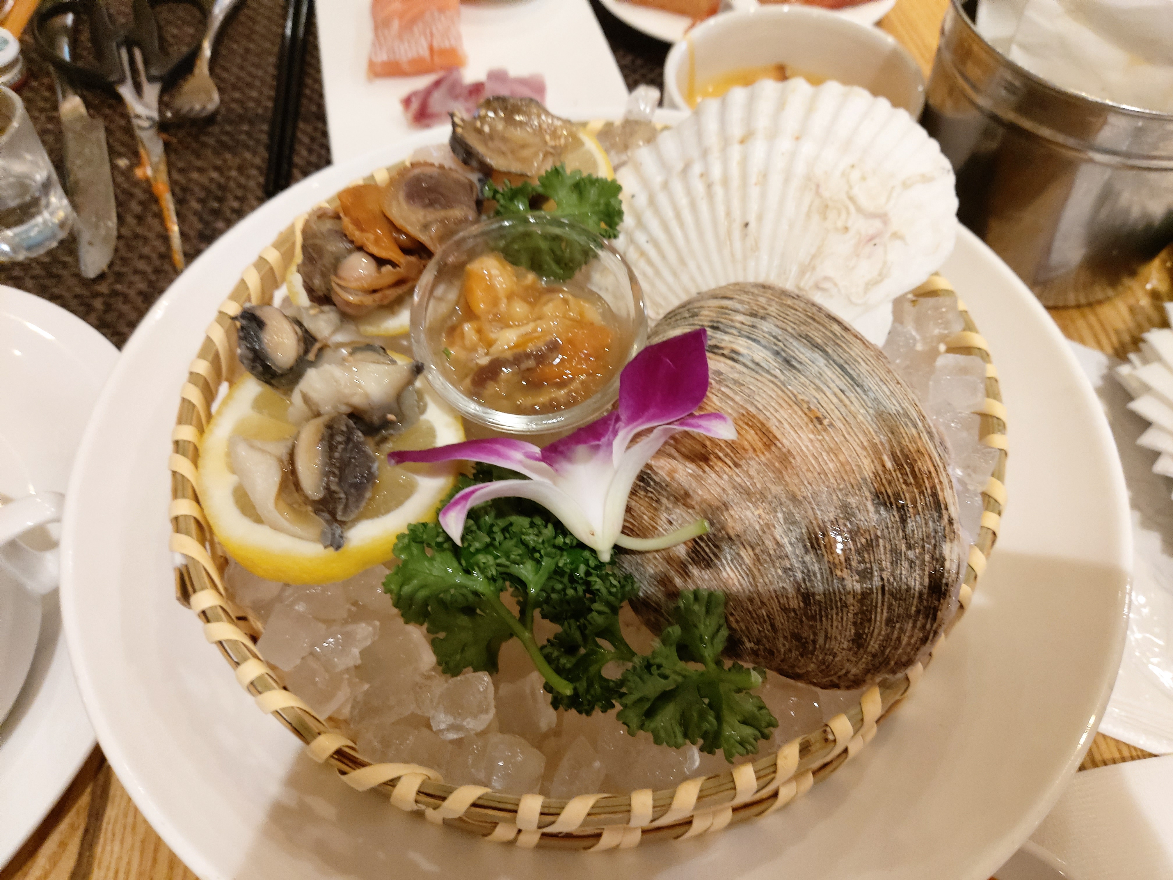 초밥의 퀄리티는 중급 이상은 되는것 같았어요. 아주 뛰어나진 않았지만 충분히 맛있게 먹을 만한 초밥이었습니다. 코로나 때문인지 직원분들이 모든 음식을 덜어줬습니다. 초밥도 바로바로 만들어 주었구요. 생선회도 5가지, 6가지 종류가 있었는데, 그냥 제 생각엔 회도 나쁘진 않지만 그냥 초밥만 먹는게 좋다고 생각합니다. 그리고 조개류를 생물로 주는 코너도 있습니다. 소라와 멍게도 있었는데 맛있게 잘 먹었습니다.