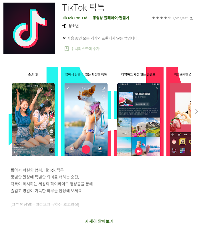유튜브와 같이 동영상을 공유하는 어플인데, 특히나 요즘 중국과 미국사이 분쟁이 생기면서 화제가 되고 있는 플랫폼 서비스 입니다. 유튜브와 다른점은 짧은 동영상을 공유 하면서 음악과 함께 공유가 되어 더 재미나게 시간을 보낼수 있는 SNS의 한 종류라고 볼 수 있습니다.