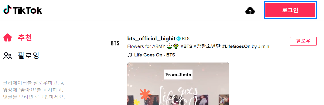 틱톡 가입을 위해서 틱톡 홈페이지에 접속을 한뒤, 아래와 같이 로그인 버튼을 눌러줍니다.