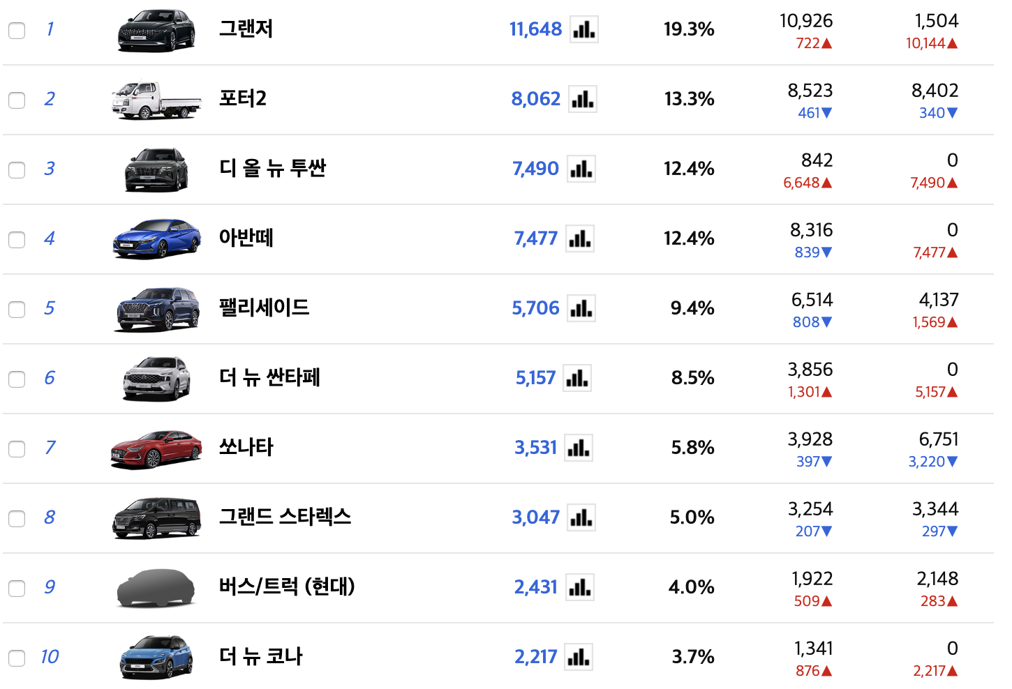 그랜저, 포터2, 디 올 뉴 투싼, 아반떼, 팰리세이드, 더 뉴 싼타페 현대를 대표하는 차종들을 제치고 당당히 3위에 올라 있습니다.