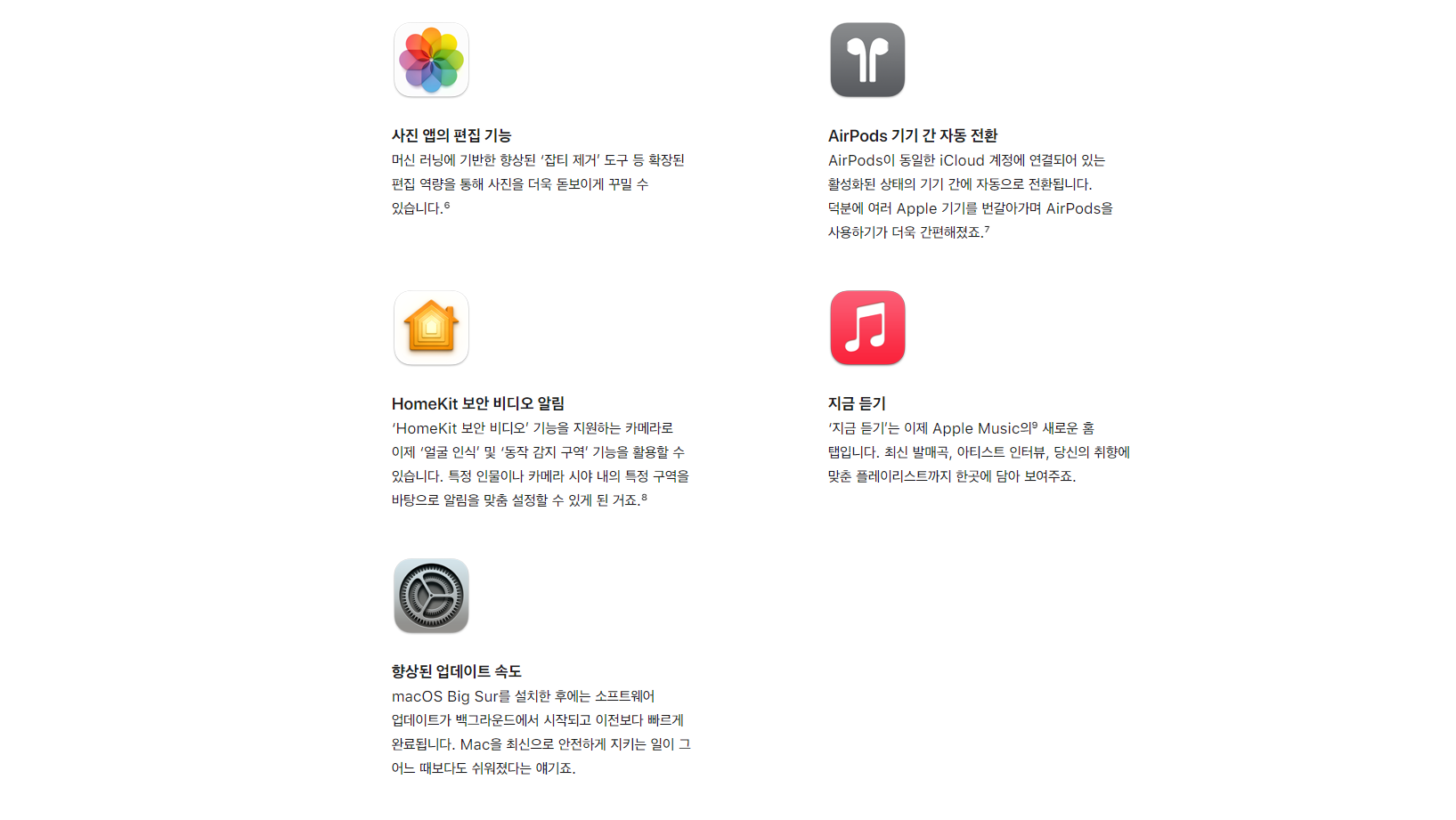 사진, AirPods, 보안 비디오 알림, Apple Music, 업데이트 속도등이 개선 되었다고 합니다.