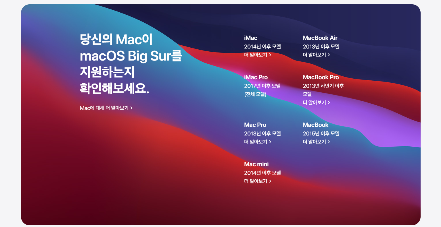 말도 많았도 탈도 많았던 macOS Big Sur의 업그레이드 지원 대상 입니다.