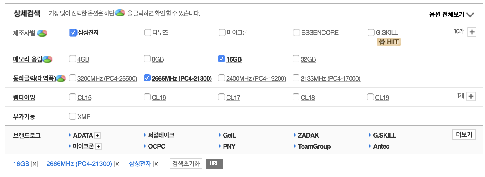 저는 보편적으로 많이들 선택하실 32기가 램을 기준으로 하여 16기가 짜리 2개를 구매하는것으로 설정하고 제품을 찾아 보겠습니다.