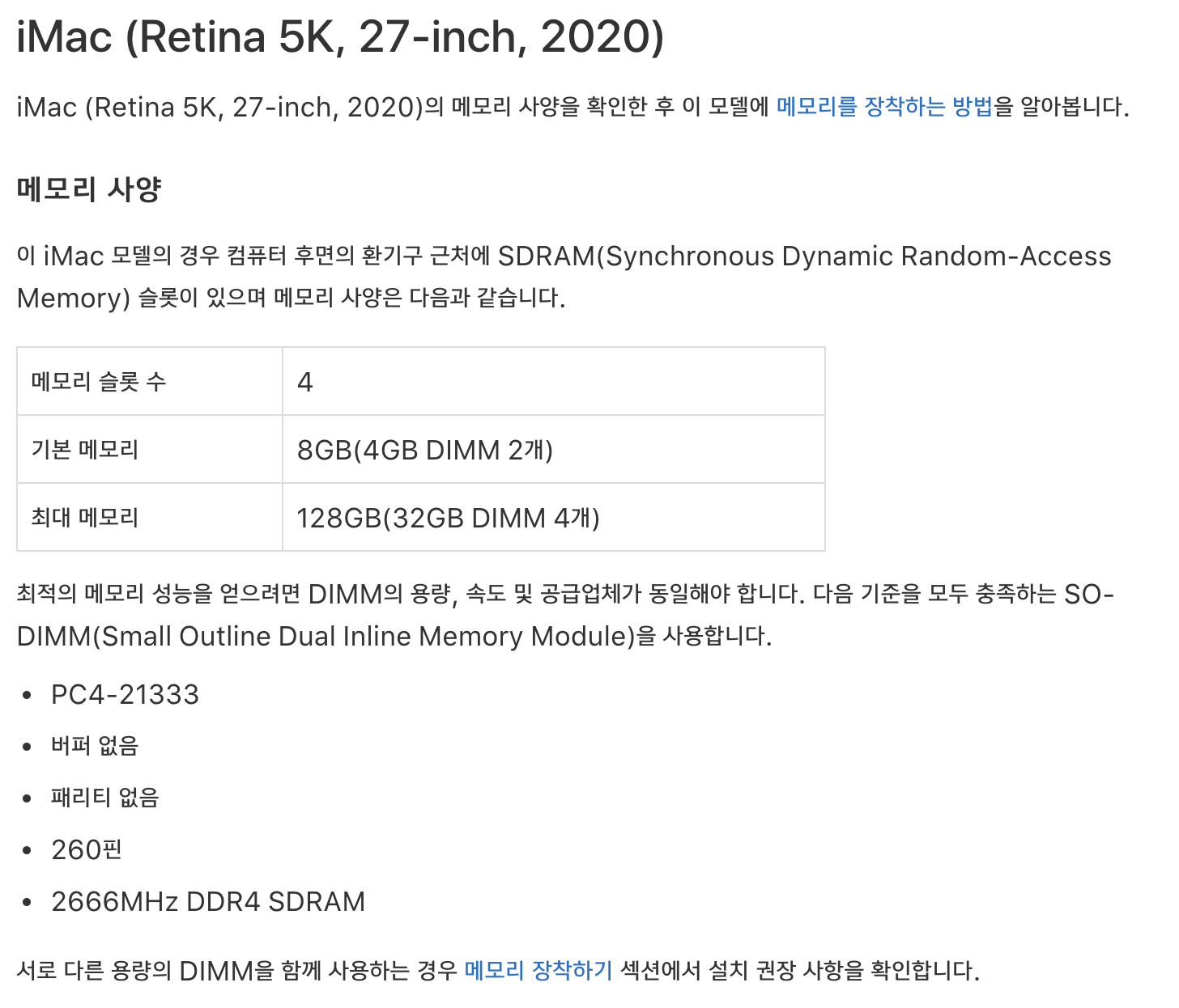 애플 공인 웹사이트에 방문하면 아래와 같은 메모리를 구해서 꼿으라고 안내가 되어 있습니다.