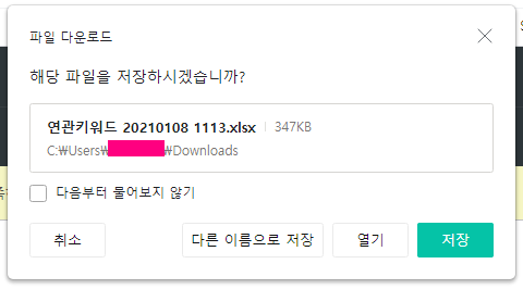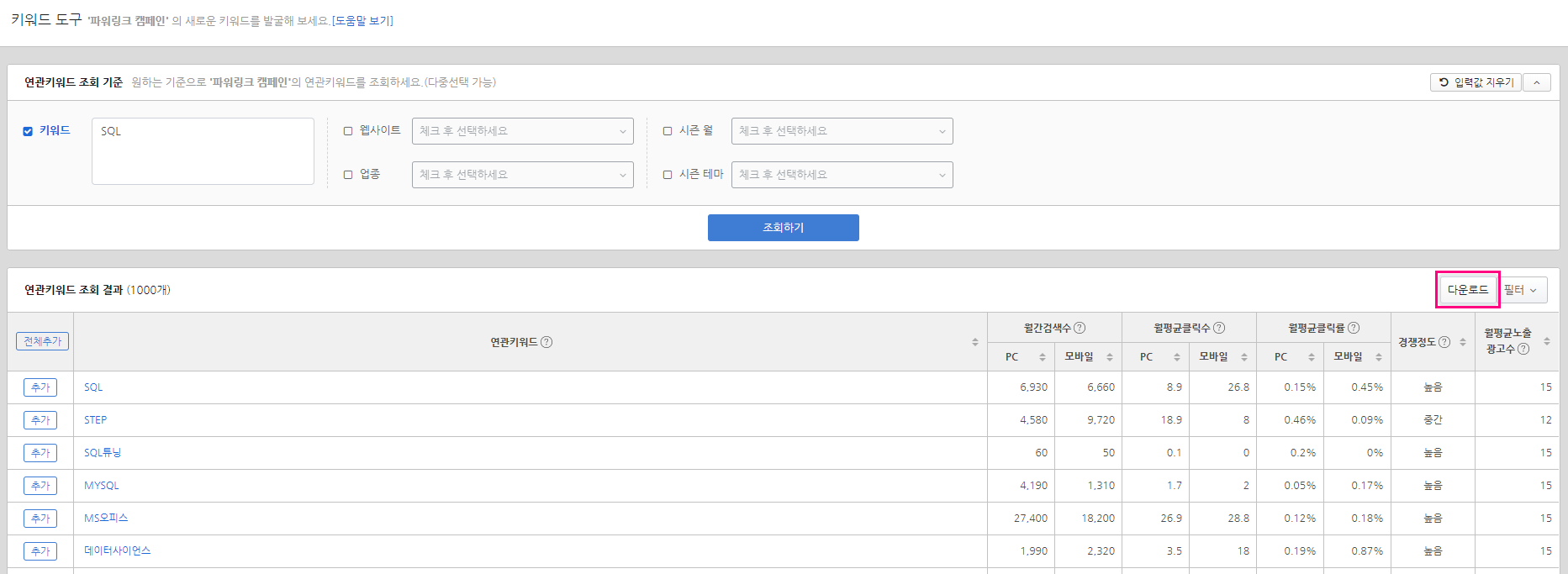 화면에서 다운로드 버튼을 클릭 하시면 검색된 키워드들의 검색 데이터를 저장 할 수 있습니다.