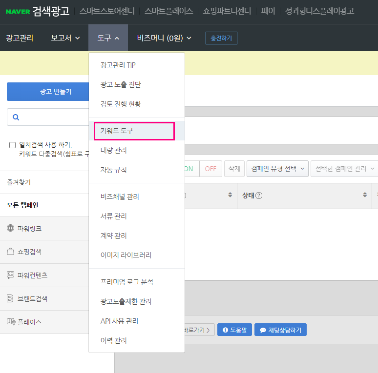 여기에서 도구 -> 키워드 도구 로 클릭하여 이동을 합니다.