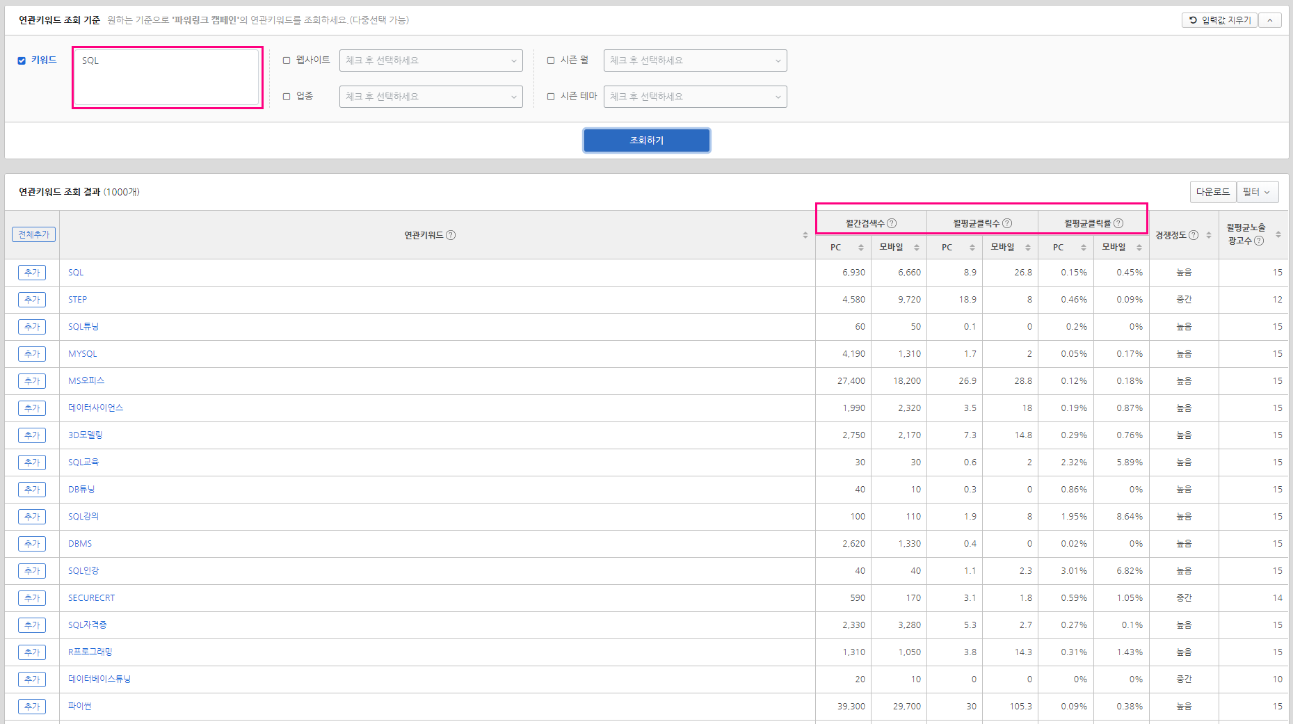 여기서 키워드를 하나 입력을 해보겠습니다. 저는 SQL 이라는 키워드를 입력을 했습니다.