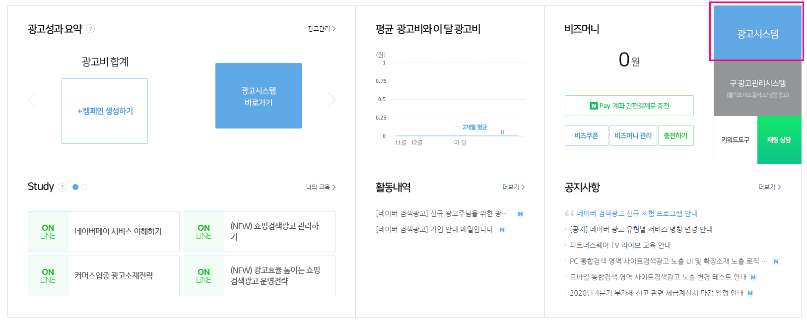 위 사이트에 접속을 하신뒤에 아래와 같이 <광고시스템> 메뉴를 클릭 하시고 들어가보십시요.
