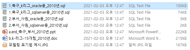 K리그 데이터가 oracle 과 sqlserver용으로 들어가 있구요. ERD도 제공이 되고 있습니다.