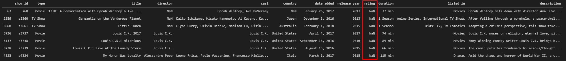 각 행 별로 rating 값을 replace 합니다. 마지막 행에서 다시 비어있는것을 출력하라고 했더니 이젠 나오지 않는것을 확인 할 수 있습니다.