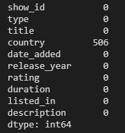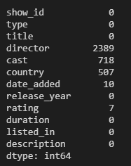 director, cast, country, date_added, rating 에서 빈 값들이 있다는 것을 확인 할 수 있습니다.