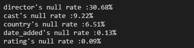 우리가 그동안 그래프로 보아왔던 결과와 같이 director의 결측 데이터가 많은것을 rate도로 확인 할 수 있습니다.