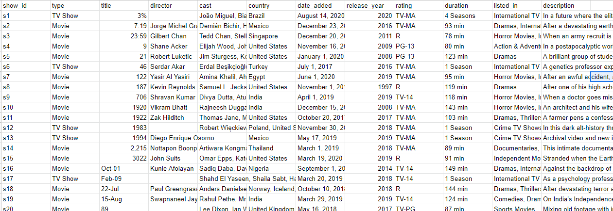 넷플릭스에 등록되어 있는 각종 영상 및 영화, 드라마등 각 프로그램별 제목, 감독, 배우 등등의 정보가 2019년 기준으로 저장이 되어 있는것을 확인 할 수 있습니다. 엑셀로 데이터를 뽑아보니 아래와 같이 정보들이 들어가 있는 것을 확인 할 수 있었습니다.