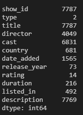 여기 나오는 숫자는 각 컬럼별 데이터에서 데이터를 group by 하였을때의 카운트 입니다. 즉, 어떤 컬럼의 데이터가 모두 유니크하다면 전체 데이터 수인 7787개가 나오게 되겠죠? 결과가 7787개인 컬럼은 show_id와 title뿐이네요. 이 두 컬럼의 데이터는 유니크한것을 알 수 있습니다.