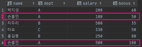 INSERT INTO salary (name, dept, salary, bonus) VALUES ('손흥민', 'A', 100, 50);