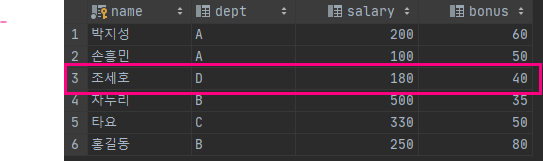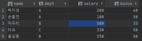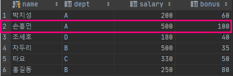 INSERT INTO salary (name, dept, salary, bonus) VALUES ('홍길동', 'B', 250, 80);