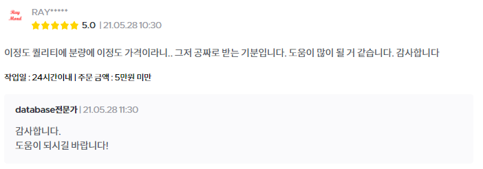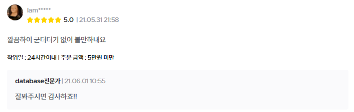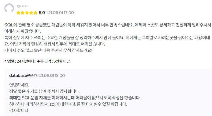 3개 총 작업 개수 완료한 총 평점 5점인 database전문가의 취업·투잡, 전자책·노하우, 직무 스킬업 서비스를 3개의 리뷰와 함께 확인해 보세요. 취업·투잡, 전자책·노하우, 직무 스킬업 제공 등 170