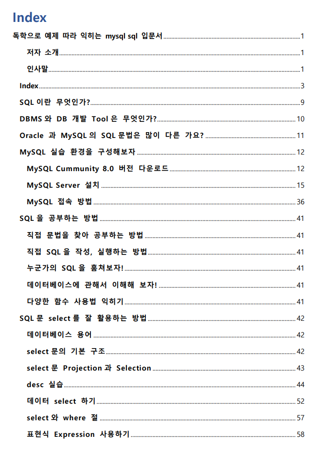 위에서도 언급을 해드렸지만, mysql이나 mariadb가 뭐지? 라고 하시는분들이 계시다면 처음부터 끝까지 따라오시면 됩니다. 어느정도 이해하고 계신 분이시면 챕터별로 인덱스에서 찾아서 보시면 되겠습니다.