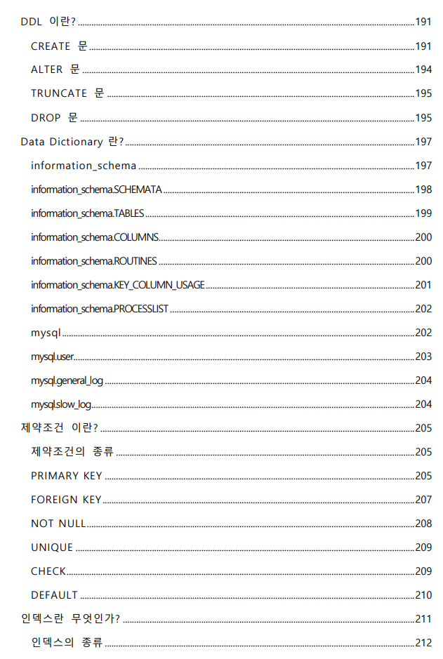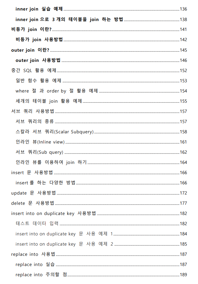 책의 내부 구성은 처음 mysql 설치부터 sql의 기본 개념을 설명하고, select 기본문법으로 시작하여 다양한 함수들과 그 사용법, 그리고 SQL을 작성하는데 있어서 가장 중요한 join 및 서브 쿼리의 개념과 응용방법이 설명 되어 있습니다. 또한 데이터 딕셔너리, 제약조건, 각종 DDL과 인덱스에 대한 부분이 있구요. 뷰에 대한 안내도 함께 되어 있습니다.
