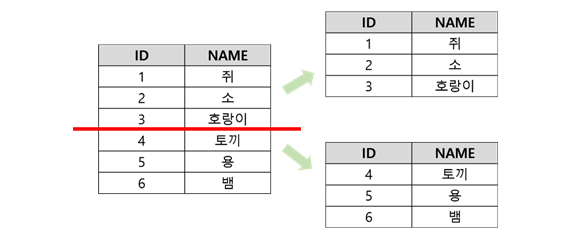 | range | 특정 파티션키의 범위, 즉 날짜에서 년도별로 한다던지, 일련번호의 특정 범위로 지정하여 테이블을 파티셔닝 하는 방법 입니다. |