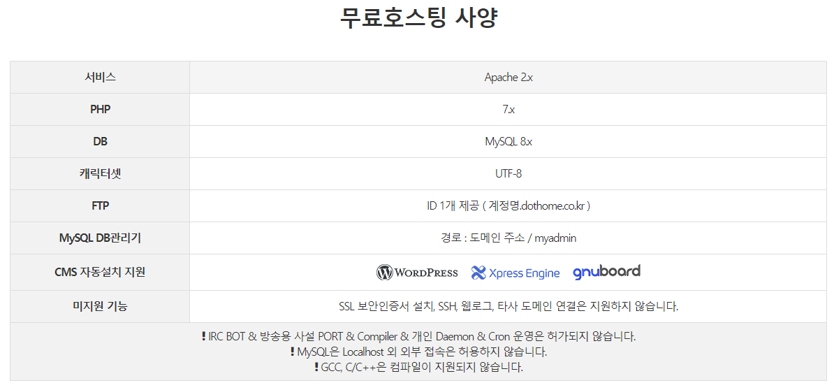 클릭해서 보면 아래와 같이 무료호스팅 사양이 나옵니다.