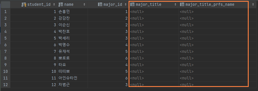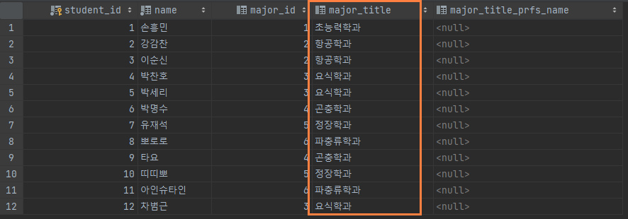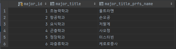 위 데이터를 보시면 major_id가 1인 초능력학과가 있고, 해당 학과의 대표교수이름은 울트라맨이죠.
