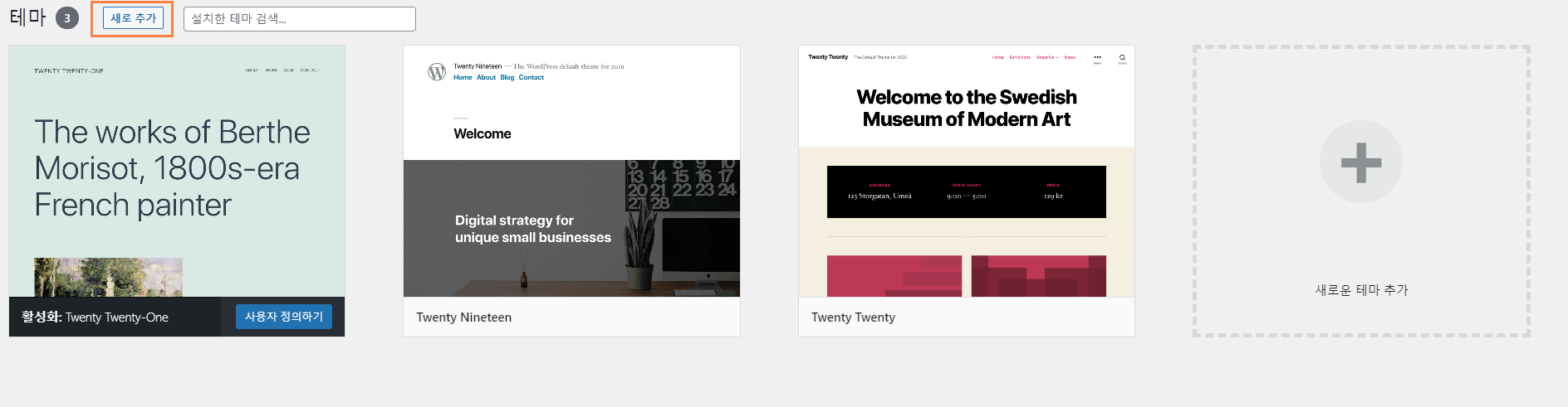 여기서, 아래 화면과 같이 새로 추가를 눌러주시면 많은 테마들을 만나실 수 있습니다.