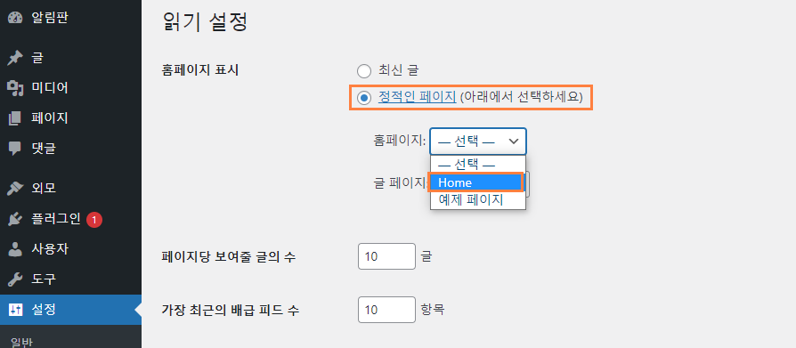 정적인 페이지, 그리고 홈페이지에서 방금 만든 Home을 설정 해줍니다.