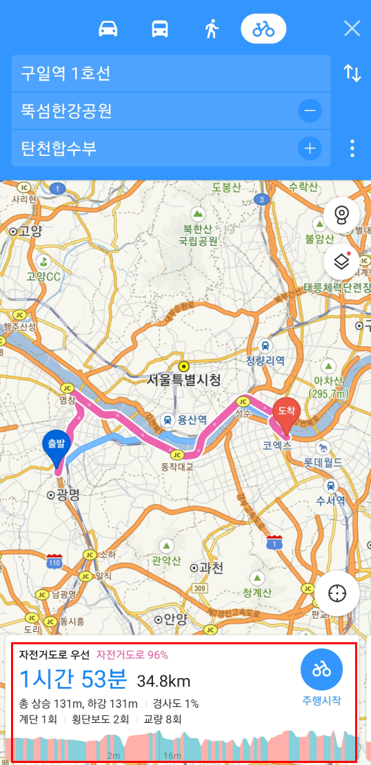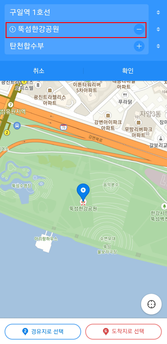 저는 뚝섬한강공원으로 경유지를 추가 하였습니다.