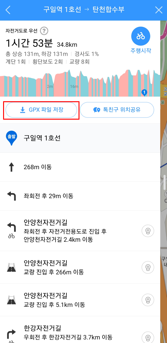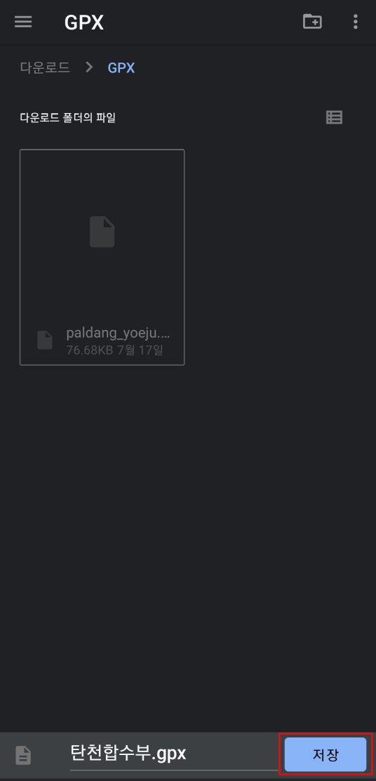 여기에서 중간에 있는 GPX 파일 저장 버튼을 터치 해주시면 됩니다.