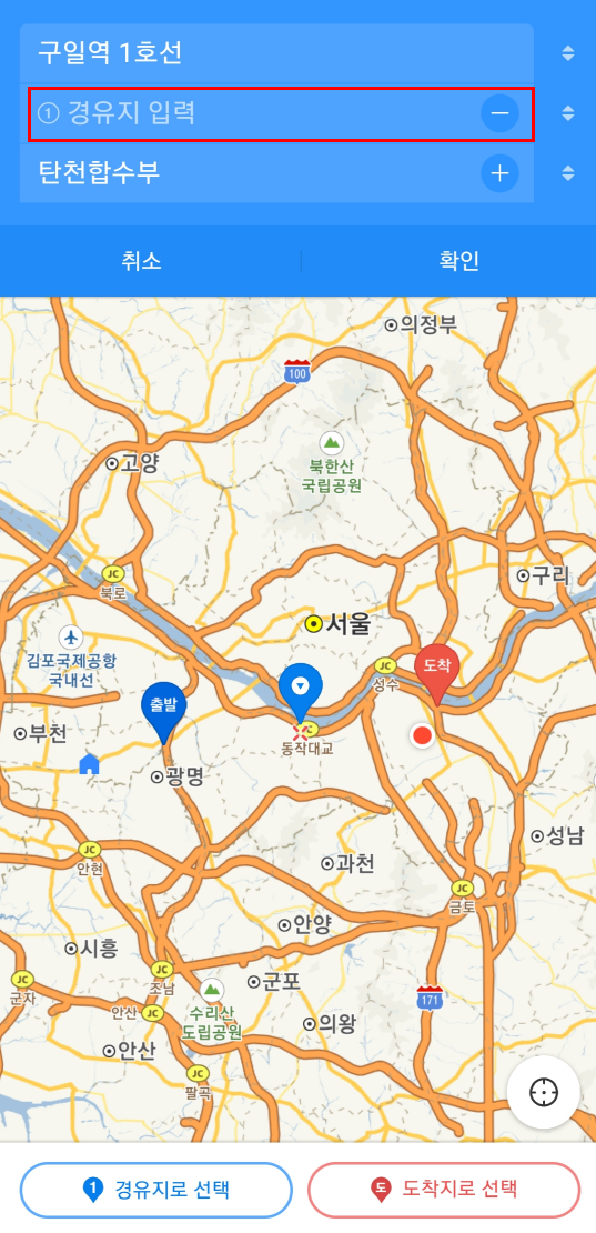 경유지 추가 기능으로 원하시는 경로를 잘 만들어 주셔야 합니다.