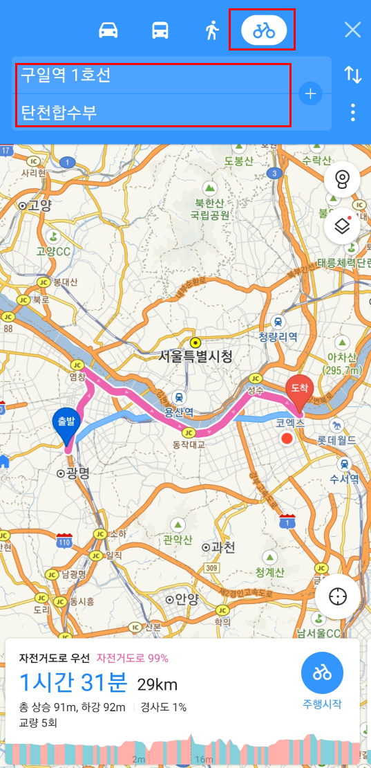 여기서 상단의 자전거모양의 아이콘을 누르고 위 화면과 같이 출발지와 도착지를 먼저 지정 해줍니다.