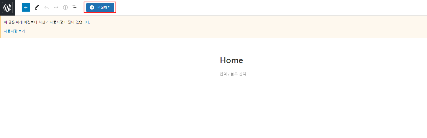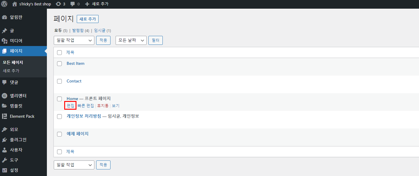 모든글 목록에서 Home 페이지를 편집하기로 들어가시면 아래와 같은 화면이 나오고, 편집하기 버튼이 상단에 보이실 겁니다. 여기서 안보이시는 분들은, 플러그인에서 element를 검색하여 설치를 다시 해보시길 바랍니다.