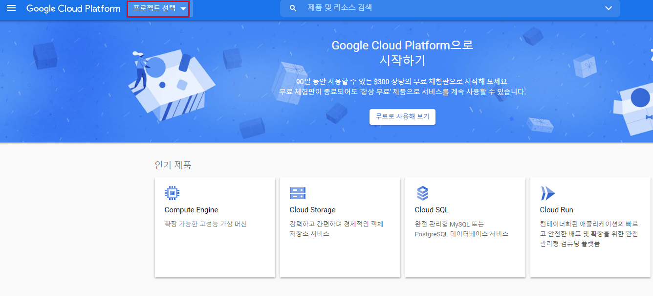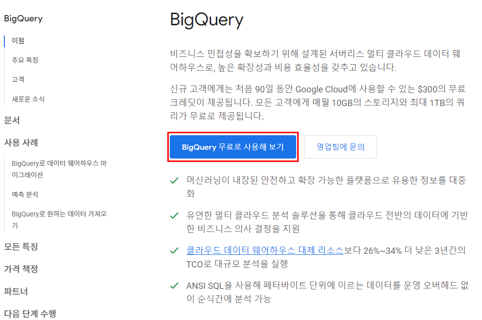 그럼 300$의 기본 크레딧이 제공 됩니다. 또한 매월 10GB 스토리지를 사용 할 수 있으며, 1TB 쿼리가 무료로 제공되는 혜택을 받으실 수 있습니다. 그럼 시작해볼까요?