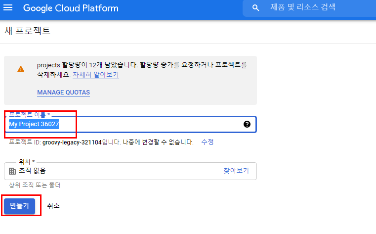 여기에서 프로젝트 이름 잘 지어주시고 만들기를 눌러주시면 진행이 됩니다.