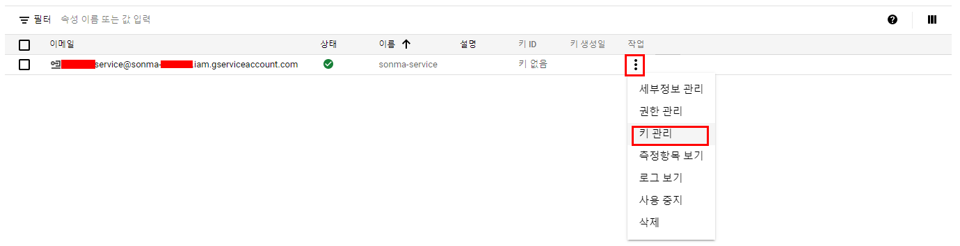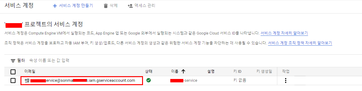 완료를 누르고나니 아래와 같이 목록에 서비스 계정이 생성 된것을 확인 할 수 있네요.
