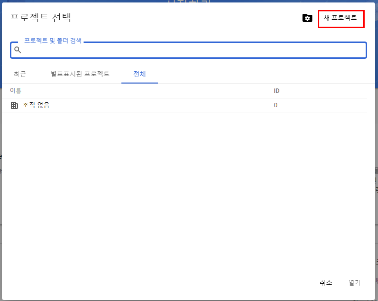 우선, 이 화면에서 프로젝트를 생성 해줘야 합니다. 상단에 있는 프로젝트 선택 버튼을 누르시고, 다음 화면과 같이 새 프로젝트를 선택해서 생성을 해주셔야 합니다.