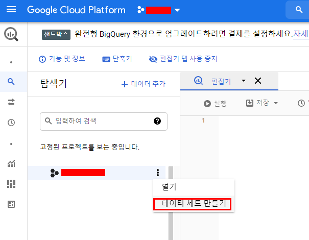 이젠 구글빅쿼리 화면이 보이실텐데, 여기서 우선 프로젝트 하위에 데이터세트를 만들어주셔야 합니다. 그리고나서 테이블을 만들던지, 쿼리를 실행하던지 해야 하는거죠.
