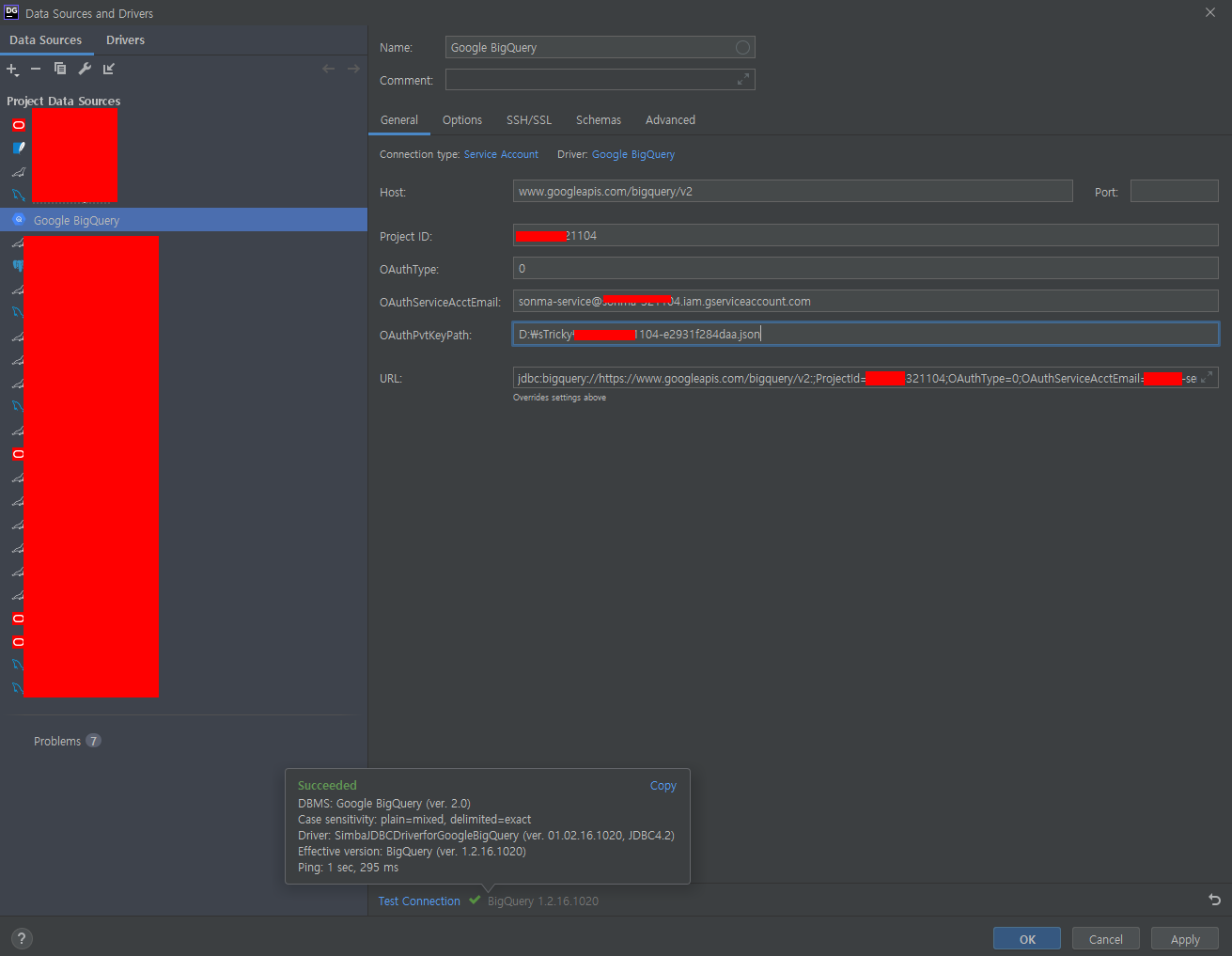 그리고 Host와 Port는 그대로 두고 Project ID와 아까 생성한 서비스 계정과 다운받은 키의 PC내 경로를 써주시면 됩니다. 간단하게 접속이 됩니다.
