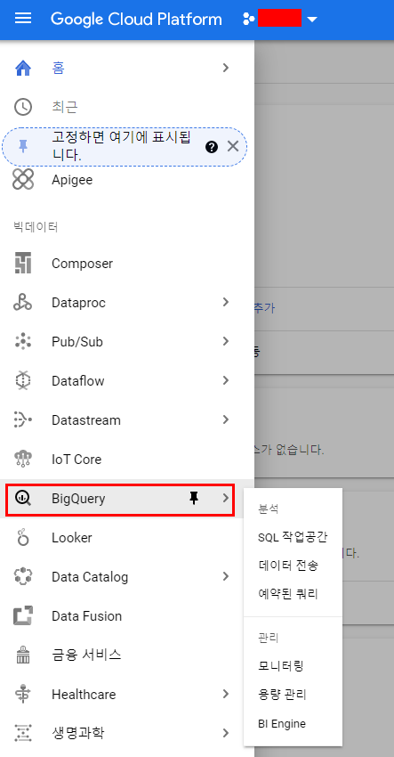 그리고 다음과 같이 좌측 상단의 삼선버튼을 눌러 스크롤을 좀 내리다 보면 BigQuery가 보이실 겁니다.