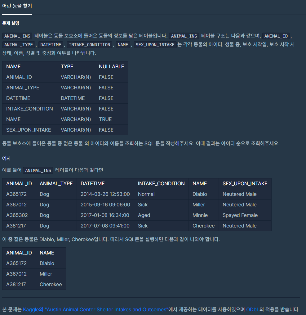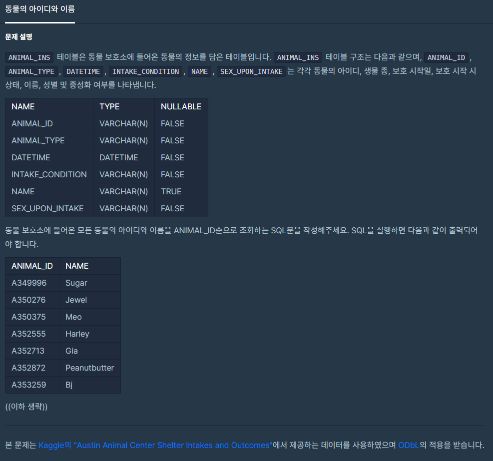 다음 문제는 동물의 아이디와 이름을 찾는 문제네요.