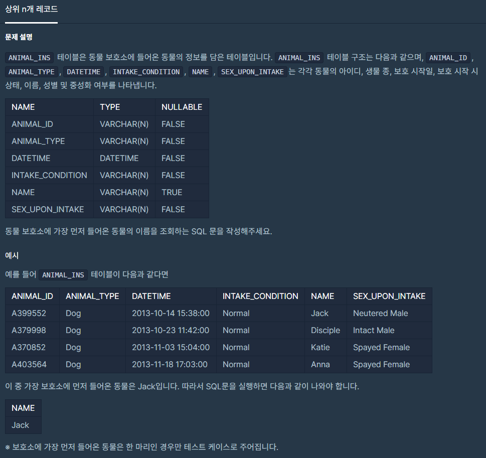 우선, 우리가 앞에서 정렬을 배웠잖아요? 가장 먼저 들어온 동물의 DATETIME값이 가장 과거의 날짜를 가지고 있겠죠?