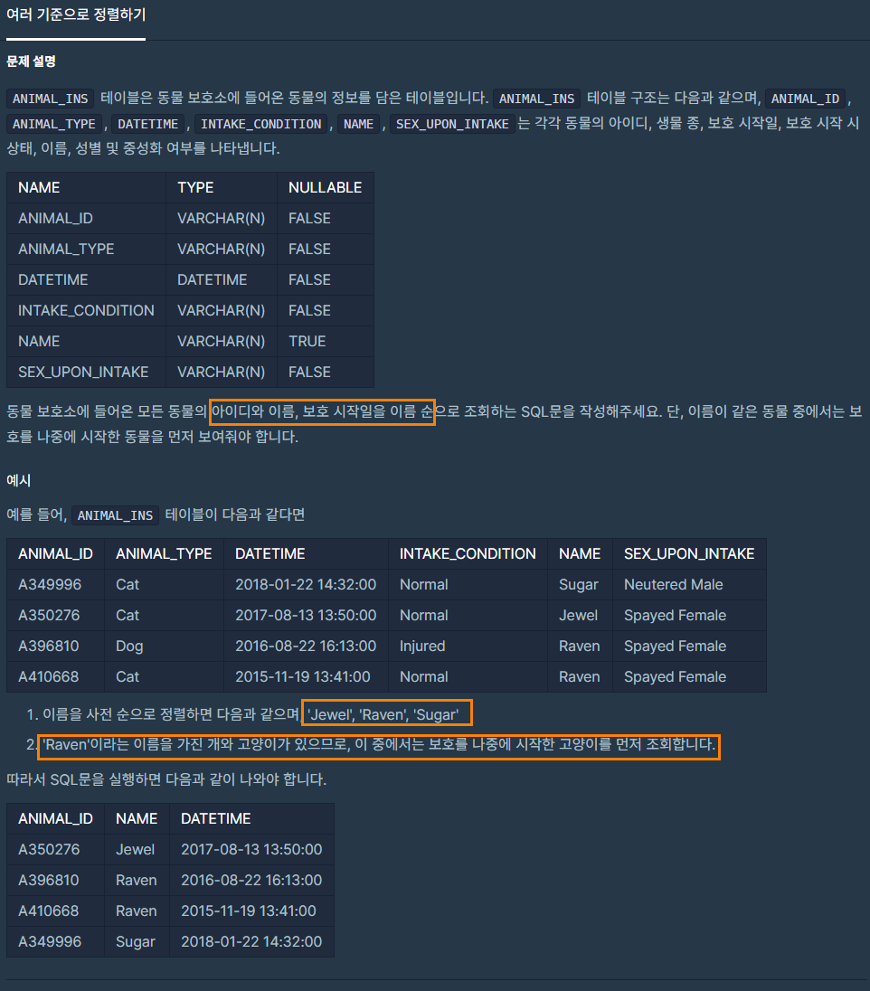이 말은 무엇이냐면, 정렬 기준이 두개가 되는건데, 먼저 이름으로 정렬을 합니다. 물론 알파벳순이 되겠죠? 그리고 나서 이름이 같은 아이가 있다면, 그땐 보호 시작일이 최근인 동물 부터 출력 하라는 의미 입니다.