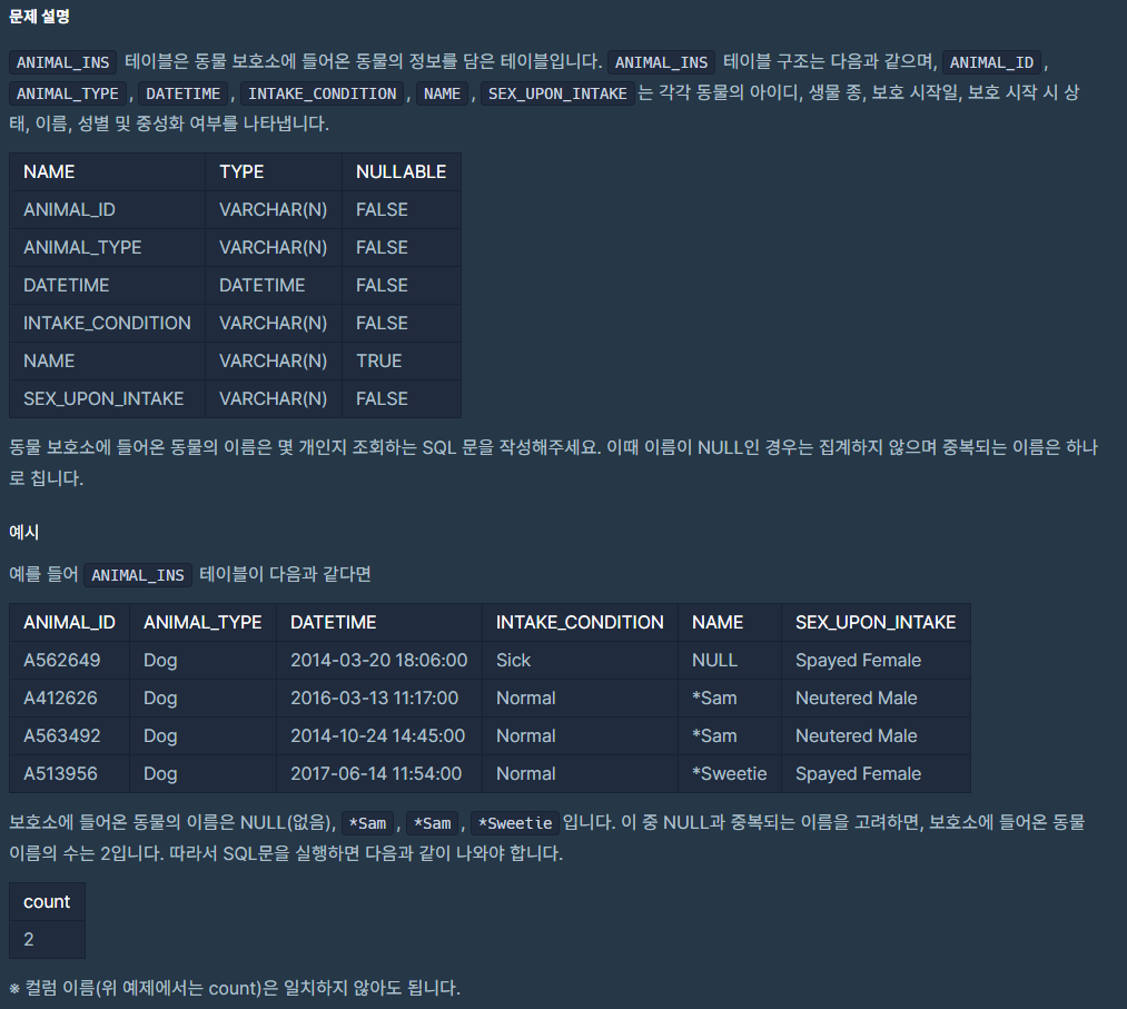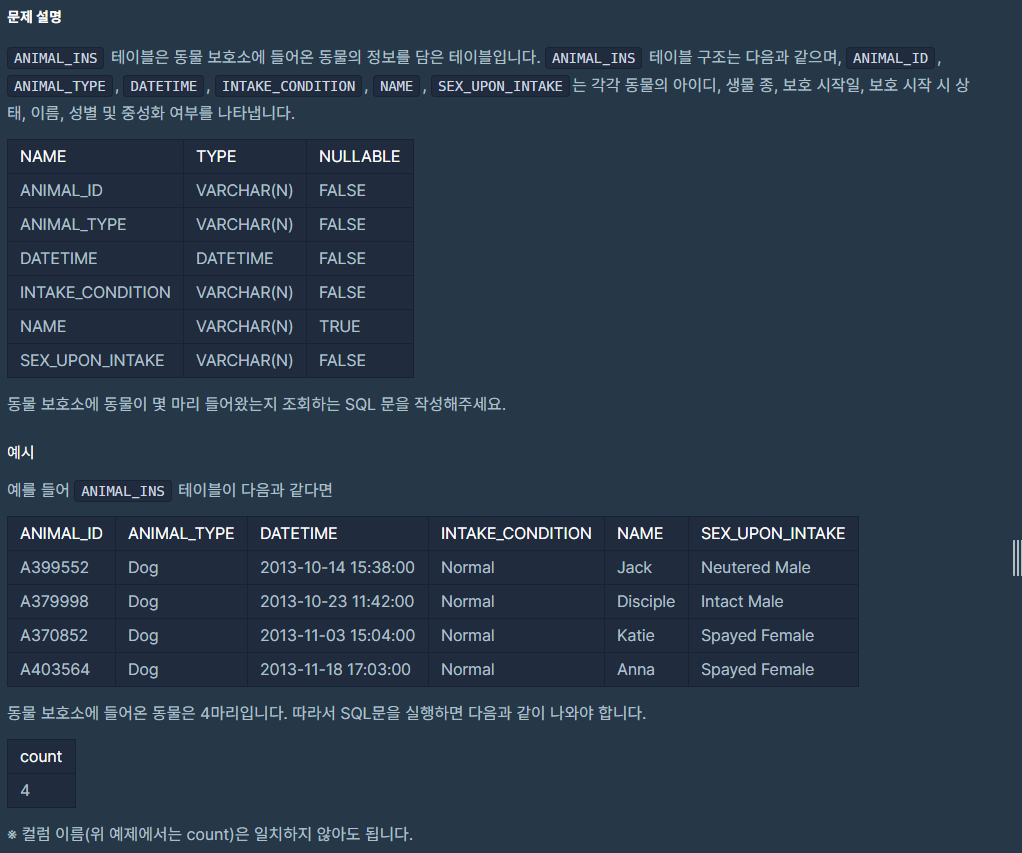 문제는 동물 보호소에 동물이 몇 마리 있는지 조회 하는 SQL문을 작성 하는것 입니다.