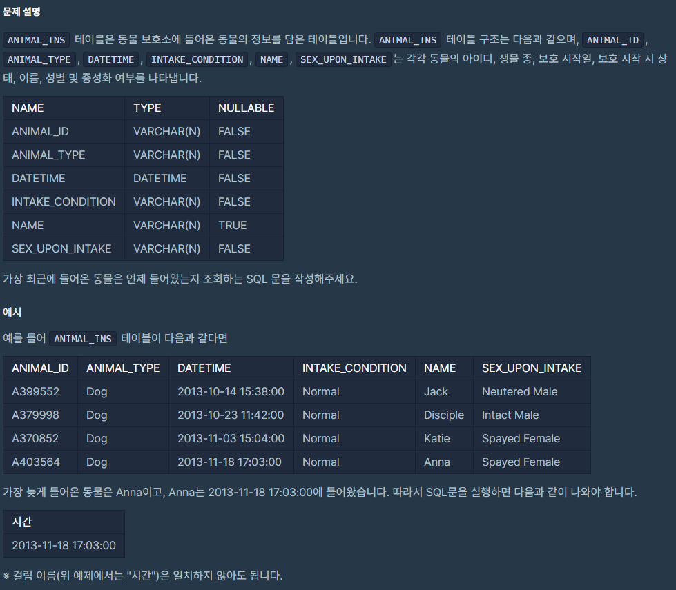 ANIMAL_INS 테이블의 구조와 데이터가 예시로 나와 있구요.