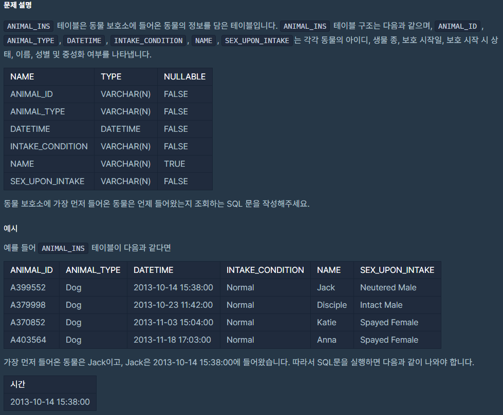 이번 문제 역시, 이전 문제의 반대이네요. 동물 보호소에 가장 먼저 들어온 동물이 언제 들어왔는지를 출력하는 문제 입니다. 가장 먼저 들어온 동물의 입소 날짜가 가장 과거의 날짜 이겠죠? 그래서 최솟값을 구하는 MIN() 함수를 사용 하여 구하면 쉽게 구할 수 있습니다.