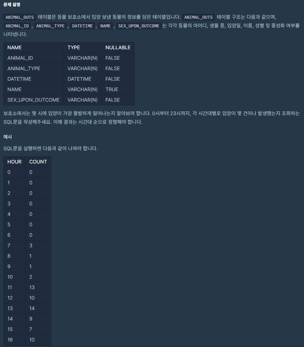 문제를 보면, 몇시에 입양이 활발하게 일어나는지를 확인 하는 문제 입니다. 각 시간대 별로 입양이 몇건이나 발생 했는지를 조회하고, 결과는 시간순으로 정렬 해야 합니다.