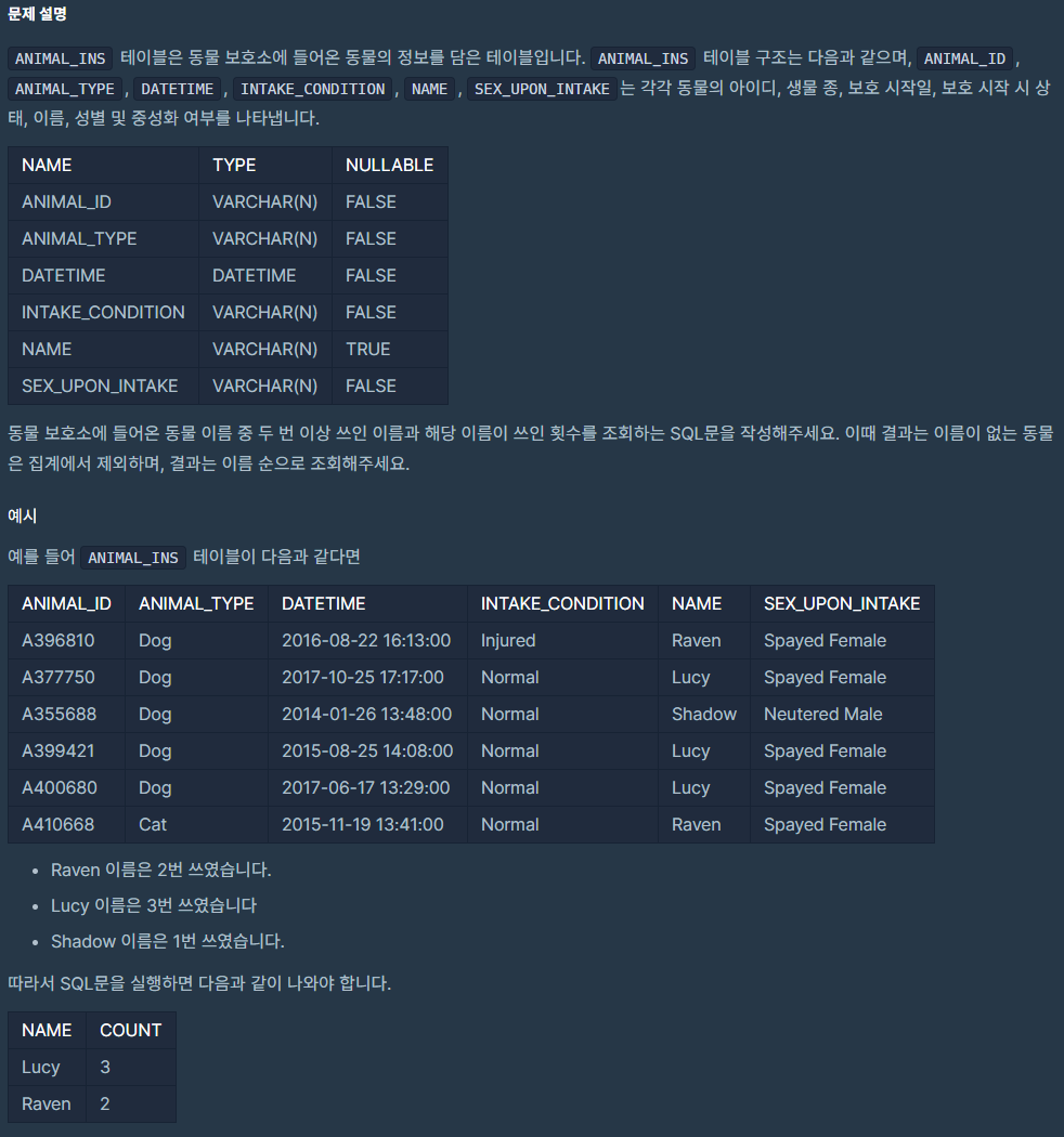 역시나 ANIMAL_INS 테이블이 주어졌구요. 여기서 동물의 이름이 동명이고, 두번이상 출현한 이름에 대해서 이름과 그 횟수를 출력하는 문제 입니다.