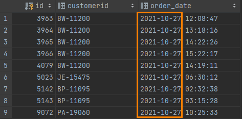 where order_date like concat(date_format(now(), '%Y-%m-%d'), '%');